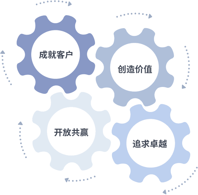 成就客户是一切决策的出发点,,,创造价值是衡量所有工作的标准,,追求卓越是我们做事做人的态度,,,开放共赢是我们的格局也是最终的结果。。。。价值观的齿轮环环相扣,,推动着组织里的每个人不断向前。。